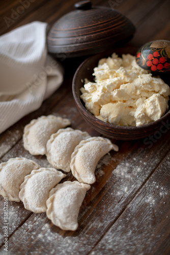 Fresh dumplings (varenyky) filled with cottage cheese, arranged on parchment paper alongside a bowl of cottage cheese and a white kitchen towel. The wooden background and flour-dusted details
