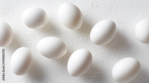 Fresh farm eggs, scattered on white, simple culinary ingredient