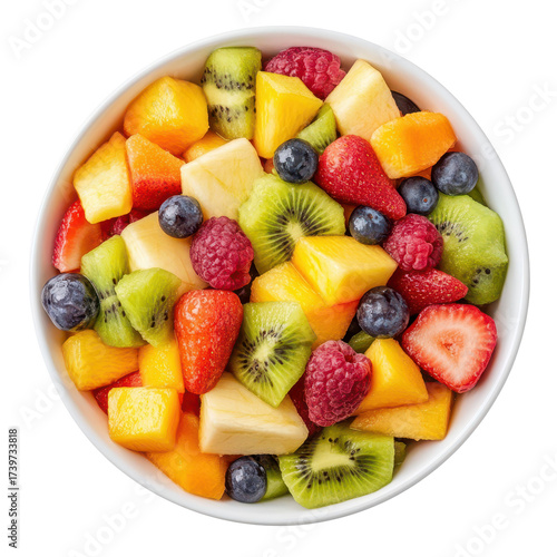 Fresh fruit salad in white bowl with kiwi, strawberries, blueberries, raspberries, and melon chunks, viewed from above