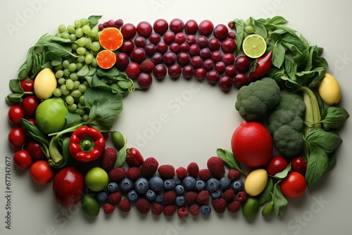 Fresh fruits and berries, tomatoes within beautiful design on white background