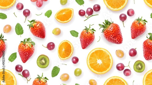 Fresh fruits including strawberries, oranges, and grapes, neatly arranged in a seamless pattern on a white background