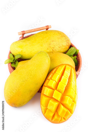 Fresh Golden Mangoes in Wicker Basket with Diced Mango on White Background