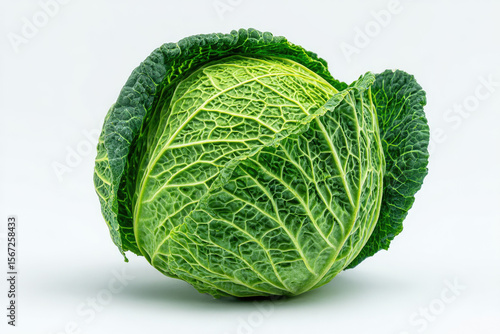 Fresh green cabbage with textured leaves displayed on a clean white background, ideal for culinary use