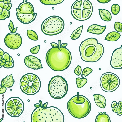 Fresh green fruits and leaves create a vibrant pattern suitable for various designs and textiles