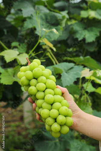 Fresh Green Grapes Held in Hand at Vineyard with Natural Foliage Background