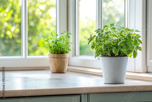 Fresh Green Herbs in Pots on Bright Kitchen Windowsill with Natural Light and Outdoors View