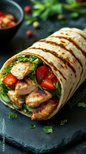 Fresh grilled chicken wrap with vibrant vegetables served on a dark stone surface