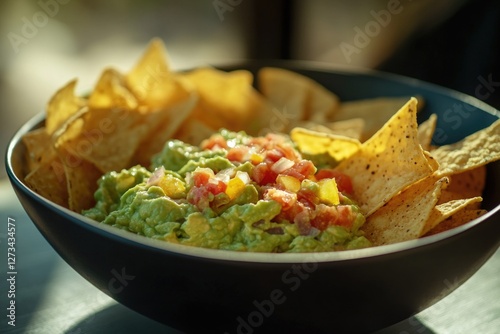 Fresh guacamole served with crispy tortilla chips, perfect for a casual gathering or snack time