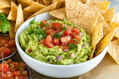 Fresh guacamole served with crispy tortilla chips, perfect for snacking or party appetizer