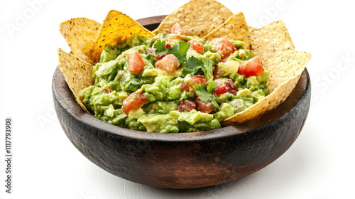 Fresh guacamole with tortilla chips in a rustic wooden bowl, garnished with tomatoes and cilantro, on a bright white background.