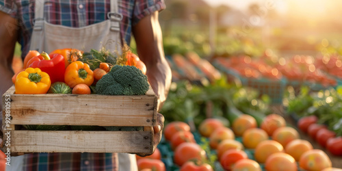 Fresh harvest in a wooden box held by a farmer