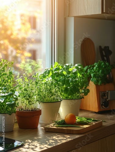 Fresh herbs and vegetables on wooden cutting board near window with sunlight in kitchen interior