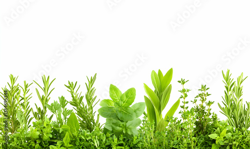 Fresh herbs border, culinary herbs, rosemary, basil, thyme, sage, oregano, parsley, white background, healthy food concept, cooking ingredients.
