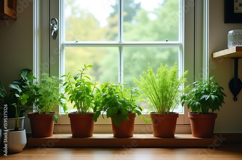 Fresh Herbs Growing in Pots on Windowsill ai generated