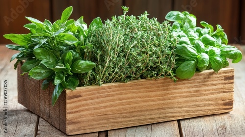 Fresh Herbs in Wooden Crate: Basil, Oregano, and Thyme