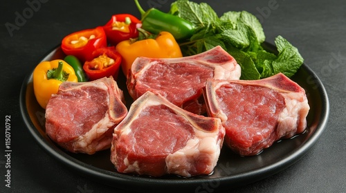 Fresh Lamb Chops with Colorful Bell Peppers and Mint Leaves