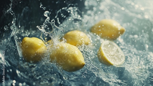 Fresh Lemons Splashing in Water on Dark Background