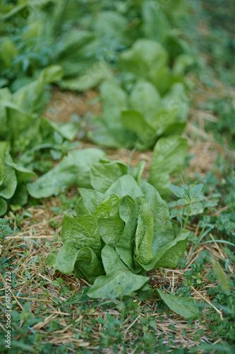Fresh lettuce plants growing in organic garden rows with straw mulch