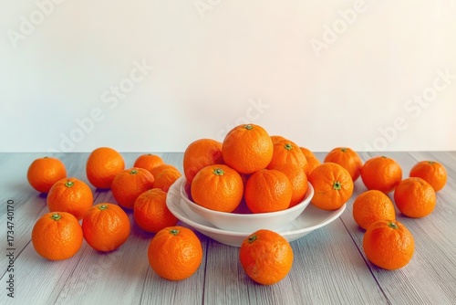 Fresh mandarin oranges arranged on light wooden table with white plates