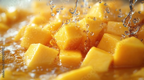 Fresh mango chunks being washed in water.