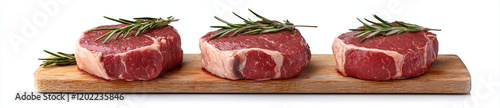 Fresh meat steaks with rosemary on wooden board, perfect for grilling or cooking. vibrant colors and textures evoke sense of culinary delight and freshness