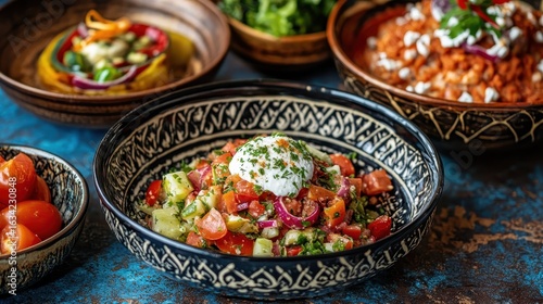 Fresh Mediterranean Salad with Herbs and Creamy Topping in Bowl