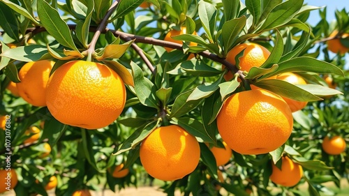 Fresh orange hanging on a tree branch in a sunny orchard, citrus, fruit, orange