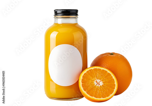 Fresh orange juice in a glass bottle with whole and sliced oranges Isolated on transparent background