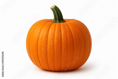 Fresh orange pumpkin with natural stem and ridged texture photographed against pristine white studio background for autumn themes