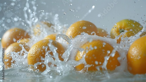 Fresh oranges splashing in water, showcasing vibrant colors and refreshing nature.