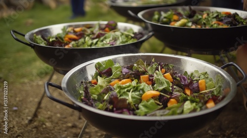Fresh outdoor salad bowls for catering event with organic ingredients