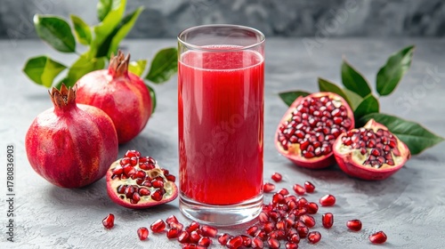 Fresh Pomegranate Juice with Whole Fruits and Seeds on Gray Surface