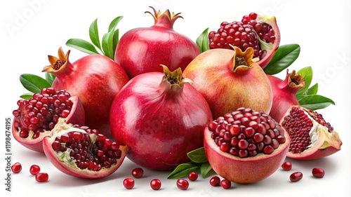 Fresh pomegranates with seeds and leaves - A vibrant display of whole and halved pomegranates with juicy seeds and fresh green leaves, symbolizing health and freshness.