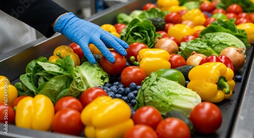 Fresh Produce Inspection: Vibrant Vegetables and Fruits on Conveyor Belt