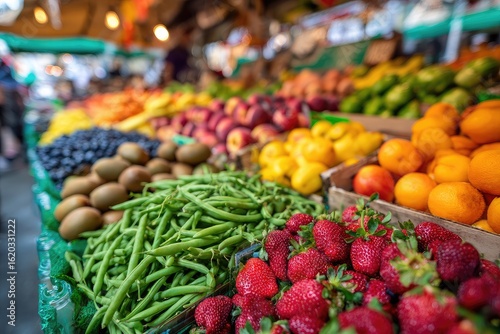 Fresh produce overflowing from market stalls. Colorful displays of fruits and vegetables. Abundant bounty