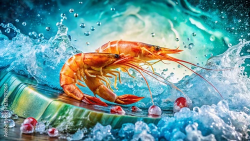 Fresh Raw Shrimp on Ice Double Exposure Stock Photo - Seafood Market