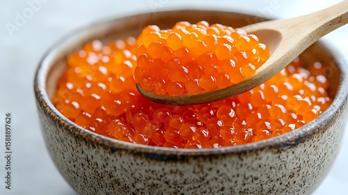 Fresh red caviar in ceramic bowl with wooden spoon, close up view of salmon roe pearls with bright orange color and glossy texture on light background.
