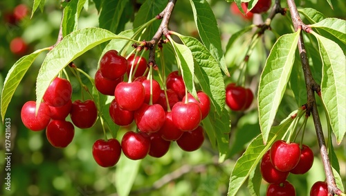 Fresh red cherries on branches with green leaves under the summer sun