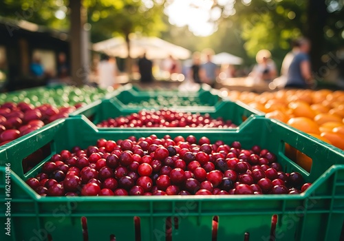 Fresh red cherries stacked in a green crate at an outdoor farmers market, with blurred shoppers in the background browsing produce.