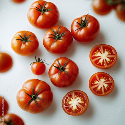 Fresh red tomatoes arranged creatively with some sliced open to reveal their interior details on a clean surface