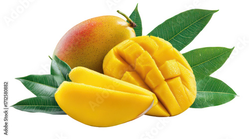 Fresh ripe mango fruit with leaves isolated on transparent background