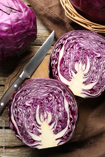 Fresh ripe red cabbages and knife on wooden table, flat lay