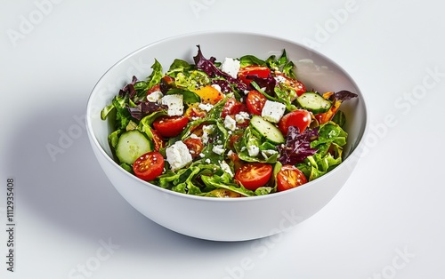 Fresh Salad Bowl A colorful salad with mixed greens, cherry tomatoes, cucumbers, and feta cheese, served in a minimalist white bowl on a white background.