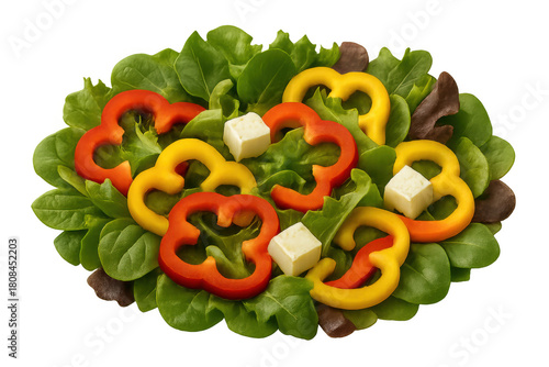 Fresh salad with colorful bell peppers and feta cheese cubes, promoting healthy eating and balanced nutrition on transparent background
