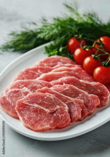 Fresh sliced pork loin on a white plate, garnished with cherry tomatoes and dill.