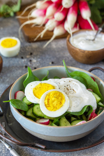 Fresh spring food, healthy vegan lunch bowl. Spinach, cucumber, radish salad and boiled eggs with sour cream.