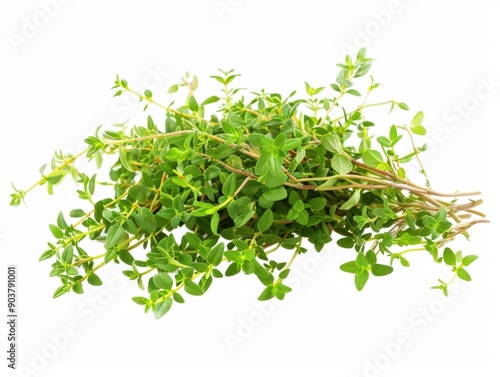 Fresh thyme sprig displayed with vibrant green leaves against a crisp white background