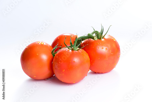 fresh tomatoes with green leaves isolated on white background