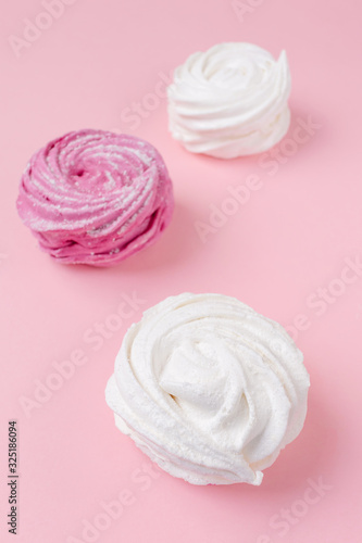 Fresh vanilla and berry marshmallows on a pastel pink background. The concept of home-cooked food, sweets. Minimalism, top view, flat lay, copyspace.