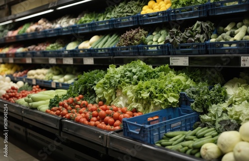 Fresh vegetables like tomatoes, lettuce, cucumbers neatly arranged in crates, on shelves in grocery store cooler. Vibrant produce display offers wide selection of greens, garden-fresh items, perfect